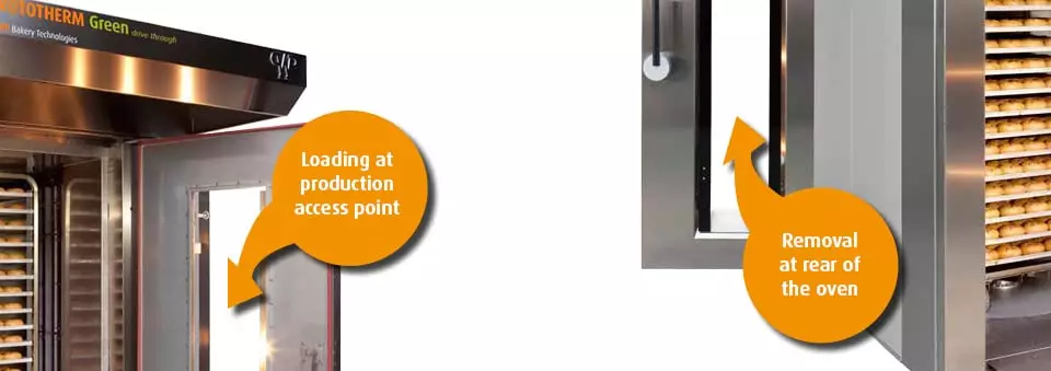 When you need to produce baked goods requiring separate production and logistics areas, for example to ensure that the baked products are kept germ-free before being packed, this model of the tried and tested ROTOTHERM® Green rack oven with front and rear doors (drive through) can demonstrate definite advantages This can be just as important in bakeries in large stores and supermarkets as in the case of baked products containing meat or gluten-free products.